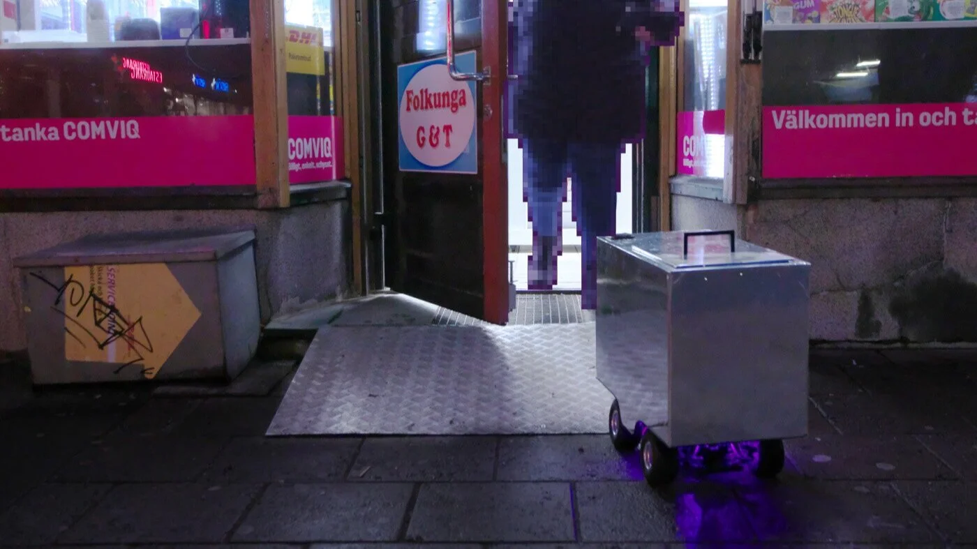 The radio-controlled drone prototype entering the post-office/candystore in Bagarmossen