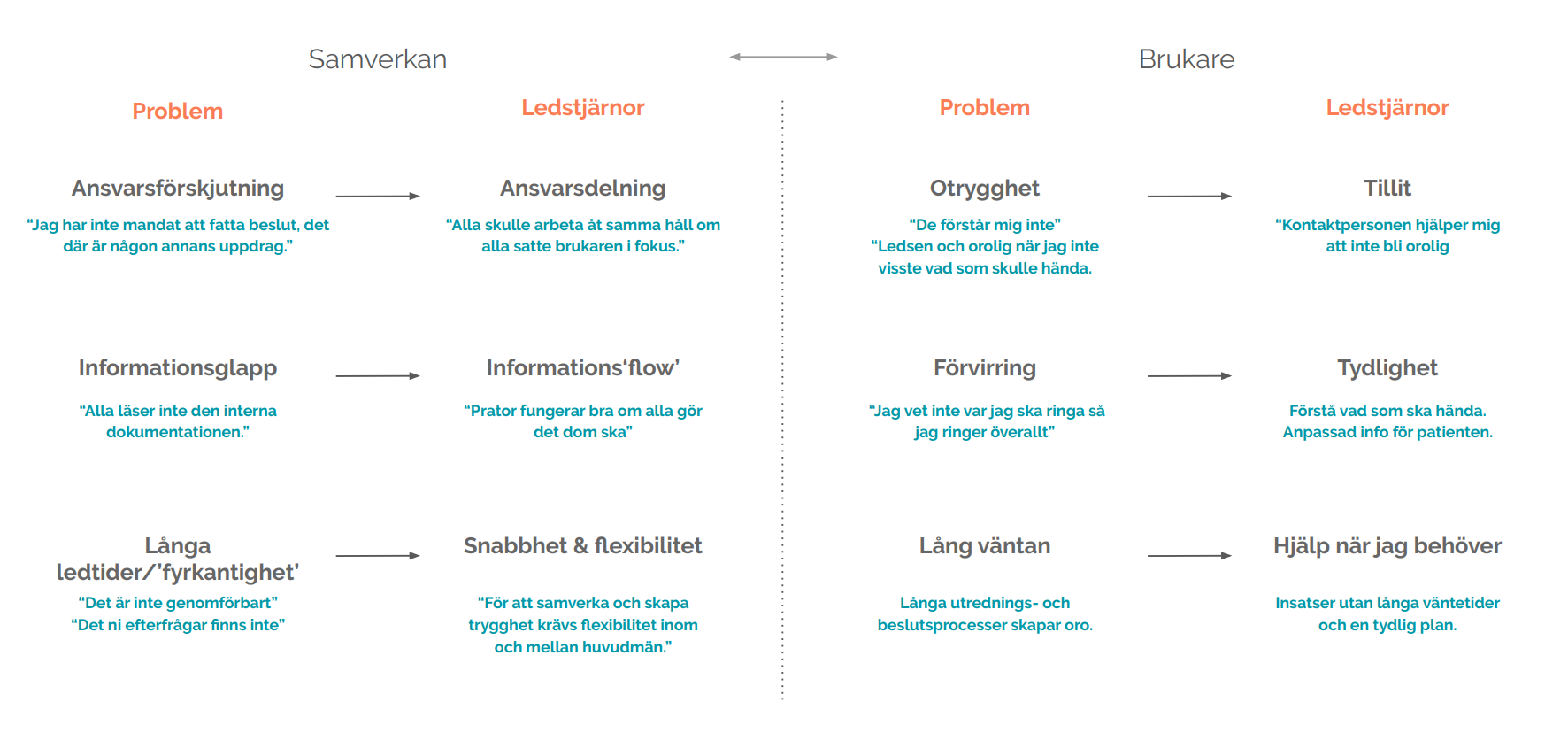 Ett viktigt mål var att hitta bättre gemensamma arbetsformer för samverkan mellan alla inblandade instanser. Vi genomförde workshops med representanter för alla enheter för att förstå nuläget och göra en behovskartläggning från både brukarnas och personalens perspektiv. Kartläggningen började som en enkel illustration och itererades sedan till en mer omfattande visualisering (se nedan).